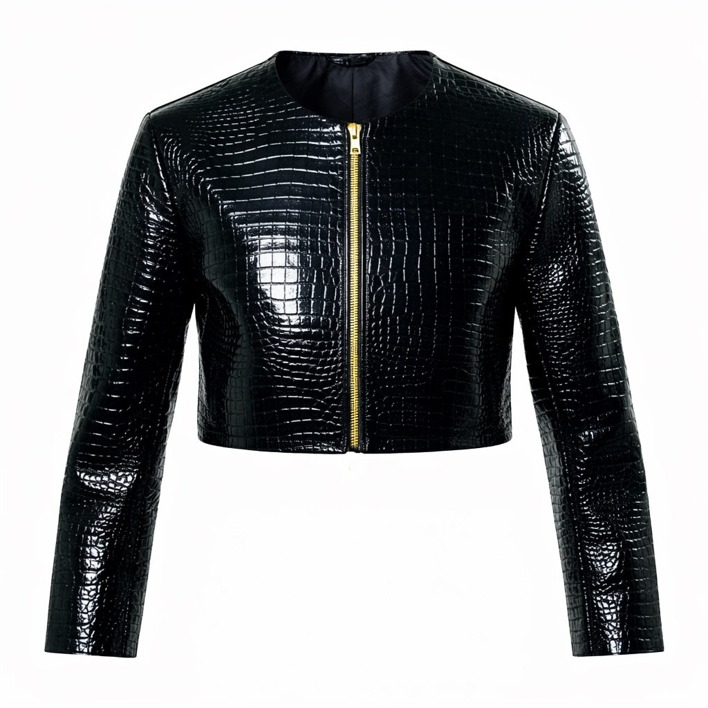 Women’s Faux Leather Black Croc Cropped Moto-Jacket